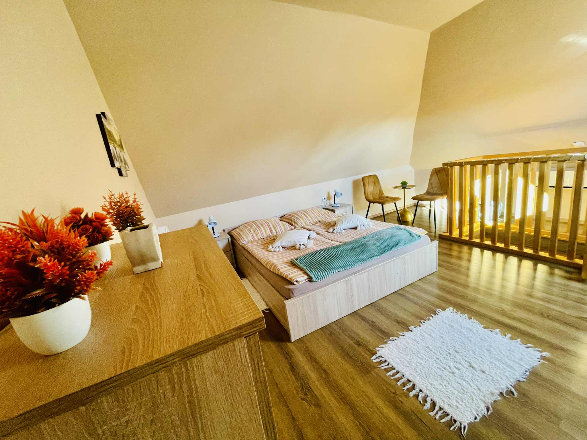 Klímával felszerelt tetőtéri 4 fős szoba: 1db kétszemélyes ágy és 2db egyszemélyes ágy, komód, éjjeli szekrény, éjjeli lámpa, asztal-székekkel, ágyneműk